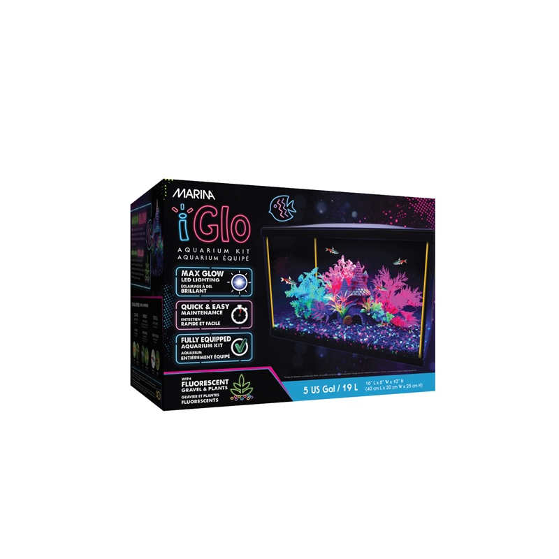 The Marina iGLO series accentuates fluorescent colors for a fun glowing effect. The fully equipped 5 US Gal (19 L) and 10 US Gal (38 L) Aquarium Kits include unique blue LEDs, bright silicone edging and iGLO décor for maximum fluorescence, with a Marina Slim series power filter and included media offers easy and effective cleaning to keep your aquarium healthy.