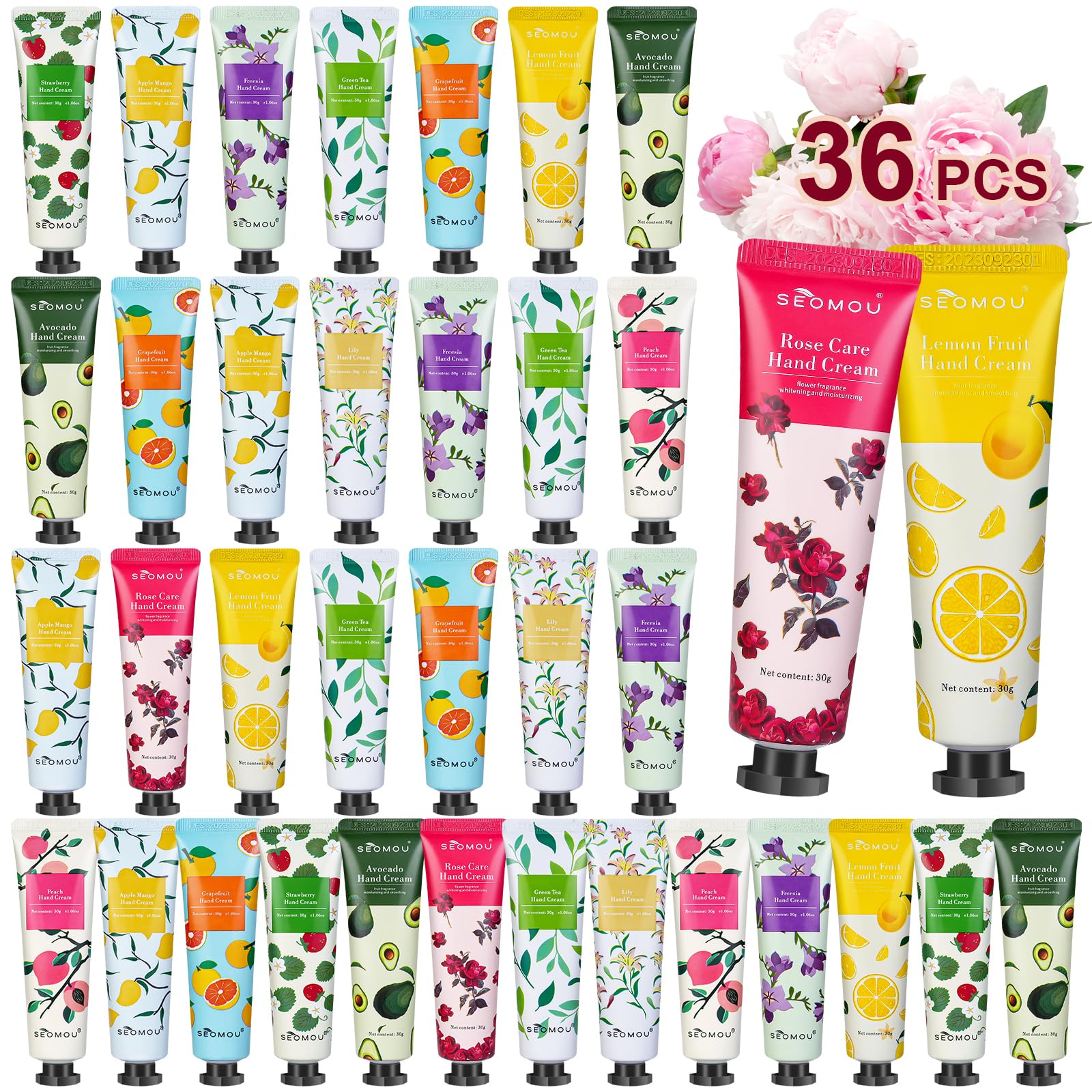 - 36 Hand Cream Bulk: Contains 10 different scented hand creams, specifically lemon、avocado、green tea、freesia、grapefruit、apple mango、rose、peach、lily、strawberry. There are enough scents and quantities for you to choose from to meet your needs at different times. You can also share their favorite scents with family and friends.