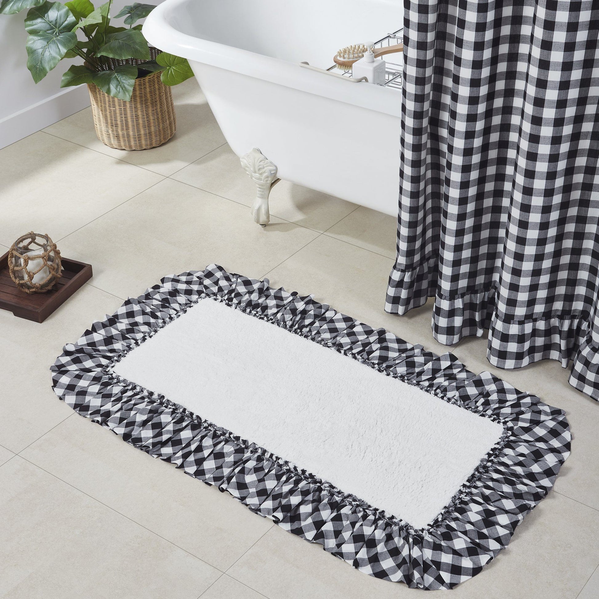 Our Annie Black Buffalo Check Bathmat would be the perfect final touch to your bathroom. It measures 27x48" and features a beautiful soft white fabric with a black and antique white check fabric bordering it. It is made from 100% cotton and has a rubber underside to prevent slipping.