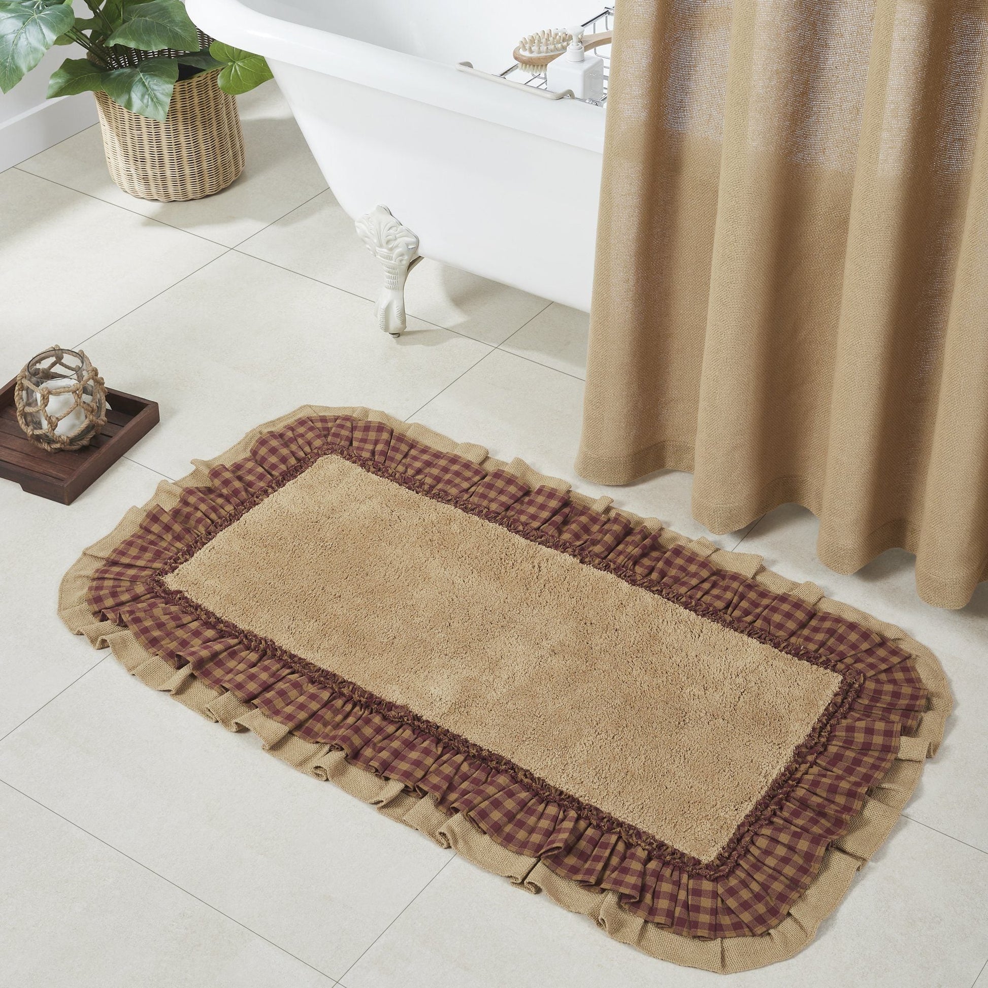 Decorate your bathroom floor with our charming Burlap Natural with Burgundy Check bathmat that will provide comfort when stepping out of the shower. Constructed from super soft cotton material, the center features an ultra-absorbent core that will help soak up water. The edge features a fancy ruffle with colors of khaki and burgundy. Coordinate your bathroom with our matching Burlap Natural Shower Curtain.